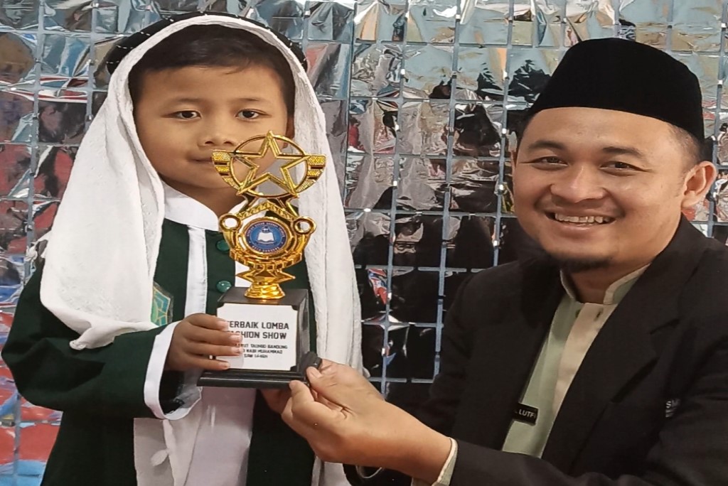 Potret penyerahan piala penghargaan kepada siswa juara Fashion Show pada perayaan Maulid Nabi (17/9/2024) di Gedung sekolah TK dan SD DT Cicadas, Jalan Ibrahim Adjie No.11, Kota Bandung.