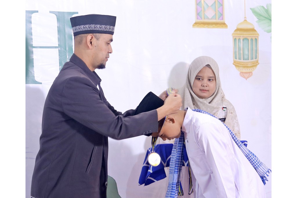 Potret prosesi pengalungan medali saat momentum Wisuda Tahfidz angkatan Ke-2 pada (5/5/2025) di GSG Rahmatan Lil’alamiin, Eco Pesantren 1 Daarut Tauhiid.